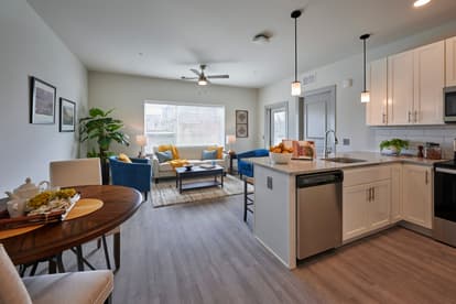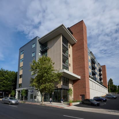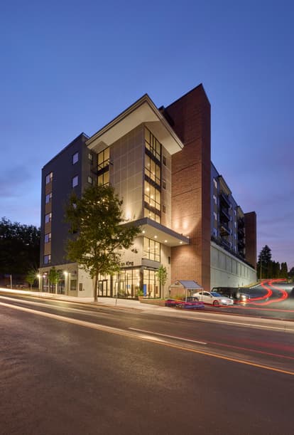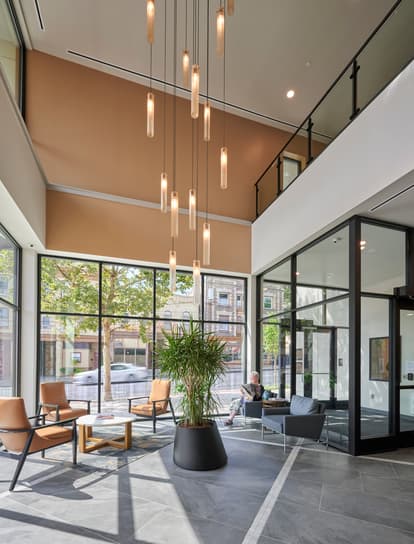 The seven-story building features many amenities for its urban residents. There is a large Community Room space (Conexión) on the 1st level, generously sized elevator lobbies on each floor each furnished according to a special theme, and a 6th floor glass-enclosed party room with outdoor terrace and fire table. The individual units include full kitchens, walk-in showers and spacious closets with wire shelving. Each unit has an outdoor balcony, many with dramatic views of the city skyline. A secure, fully indoor parking garage on the 1st floor has space for 41 vehicles and 24 bicycles, plus several charging stations for electric vehicles. There are property management and maintenance staff stationed on-site.