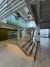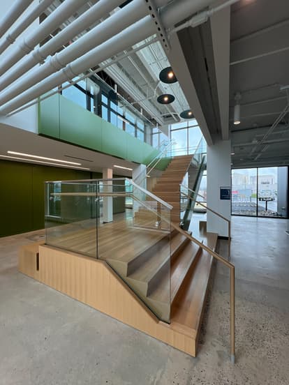 The main office space comprises roughly 70% of the building and includes open spaces with aluminum-framed glass-enclosed offices, multiple ceiling levels due to both design and existing building structure restrictions discovered during demolition, and a feature lobby with a pantry-kitchen space and a monumental stair with all wood treads, risers, landings, and a first-floor platform with benches. The remaining 30% of the building consists of the warehouse, shop, and locker room spaces, which feature an overhead crane, an industrial racking system, and multiple floor levels due to exterior access and existing loading docks.